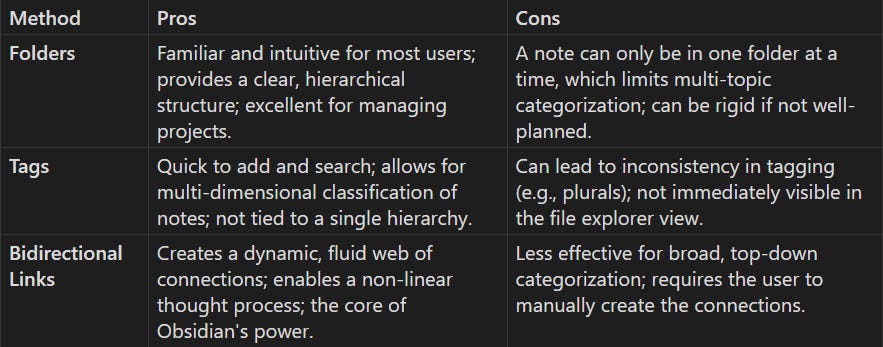 As your vault grows, organizing your notes becomes essential. Among Obsidian users, the use of folders, tags, and links often sparks lively debate. New users should know there’s no single “right” way to organize notes. Instead, the best approach is to understand the strengths and limitations of each tool and use them together effectively.