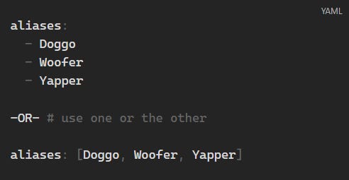 This note titled “Dog” can now be linked to using any of the aliases: `[[Doggo]]`, `[[Woofer]]`, or `[[Yapper]]`.