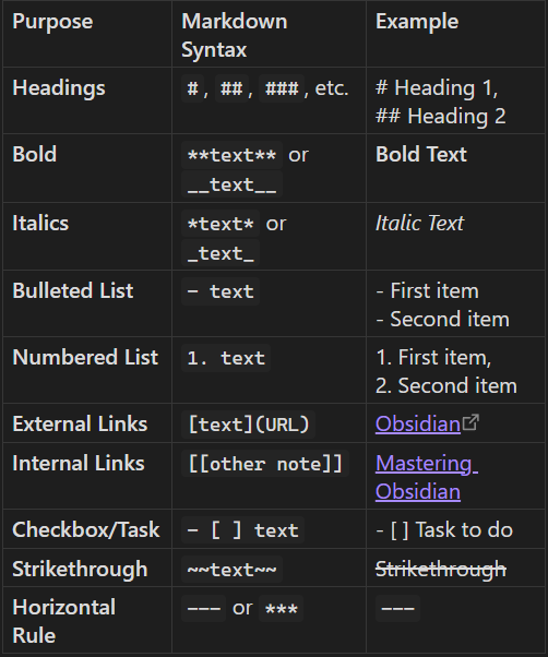 Obsidian’s editor uses Markdown, a simple syntax for formatting plain text. While it may sound technical, Markdown is intuitive and easy to read even without formatting applied. Unlike rich-text editors, Markdown keeps your writing environment clean and distraction-free. Below is a quick reference for essential Markdown commands to help you get started.